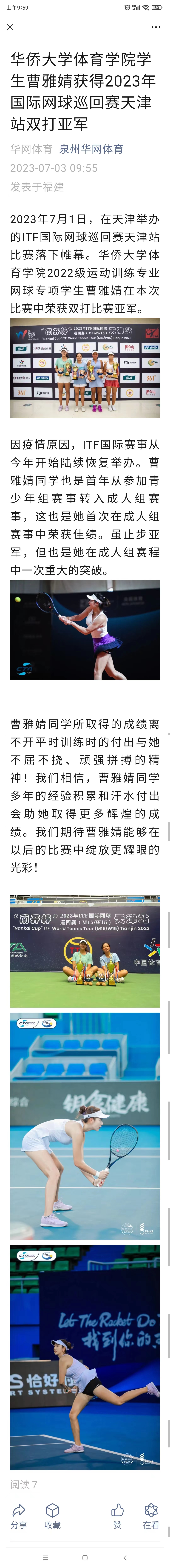永利yl23411集团2022级运动训练专业网球专项学生曹雅婧获得2023年国际网球巡回赛天津站双打亚军