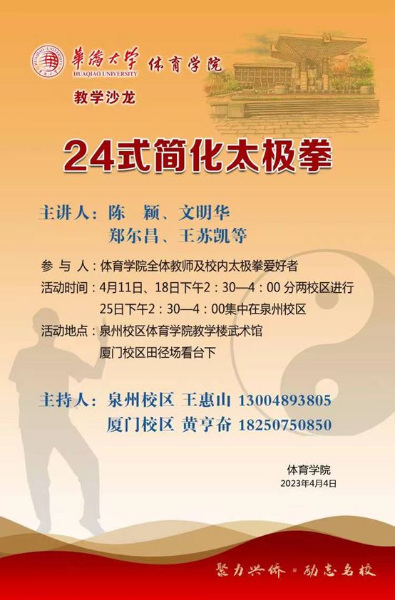 为贯彻学校 “面向海外,面向港澳台”的办学方针,秉承“为侨服务,传播中华文化”的办学宗旨,我院分别于4月11日、18日、25日举办太极拳教学沙龙活动。本次活动致力于校园全民健身与竞技体育融合发展,更好的将中华太极文化推向五湖四海。本次活动由学院工会、公共体育部负责,并得到了学校的大力支持。