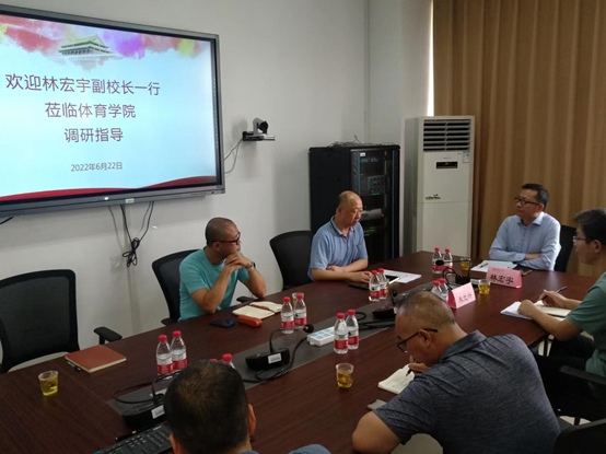 林宏宇对学院班子的工作,尤其是在校园体育等方面所取得的成绩表示肯定,指出学院应聚焦提高体育的显示度,境外生体育教育要有特色,在传播中华传统文化方向上要有创新,找到发力点,契合、满足学校中心工作,有效融合学校主责主业,并就实际工作遇到的困难与问题做了回应,助力学院各项工作再上新台阶。
