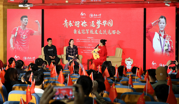 11月4日上午,我校校友、奥运冠军谌龙和李雪芮返校,亮相“青春‘羽’你,逐梦华园”奥运冠军校友交流见面会,与华大师生分享、交流、互动,共贺yl23411集团60周年校庆。
