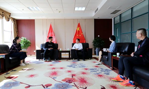 校党委书记徐西鹏与谌龙、李雪芮座谈,希望两位校友能够常回母校交流、分享,用自身经历、用体育竞技精神感染学弟学妹们,带动他们形成不畏艰难、敢于拼搏、健康向上的优秀品格。