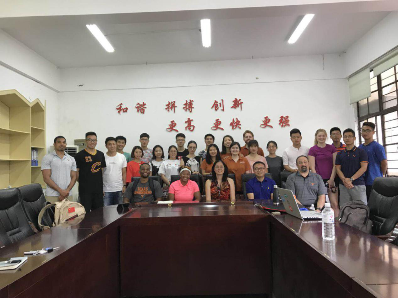2018年5月28日,德克萨斯大学奥斯丁分校代表团与我院研究生进行了交流。本次交流由德克萨斯大学奥斯丁分校两位博士的讲座拉开序幕,他们分别就大学生运动员的训练问题以及体育教师职后培训问题进行了深入探讨。Sam博士的报告讨论了学生运动员训练的目标、训练的步骤、训练的方法等实践问题,同时就训练量、与训练强度进行了深入分析,依据赛前、赛中、赛后等不同时段对量与强度进行了细化。Jeff博士是体育教师,有着20年中小学体育教学经历,目前他的研究主要聚焦于体育教师的职后培训,他认为体育教师应终身学习,而职后培训是终身学习的重要部分,职后培训要有针对性,依据体育教师个性化的需求而制定,在方法与路径上要有所突破和创新。