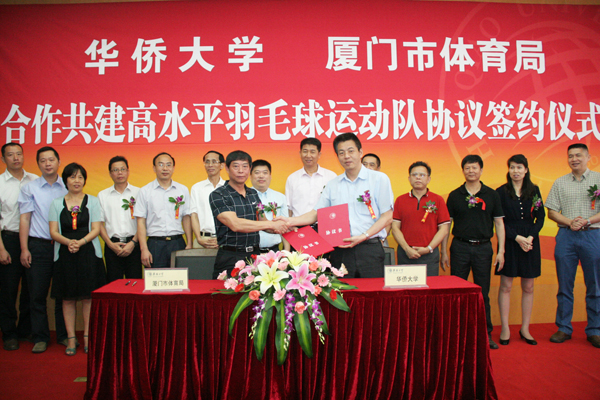 5月19日上午,yl23411集团与厦门市体育局合作共建高水平羽毛球运动队签约仪式在厦门校区国际会议交流中心举行。华大副校长吴季怀、厦门市体育局副局长颜智伟分别代表双方在协议书上签字。